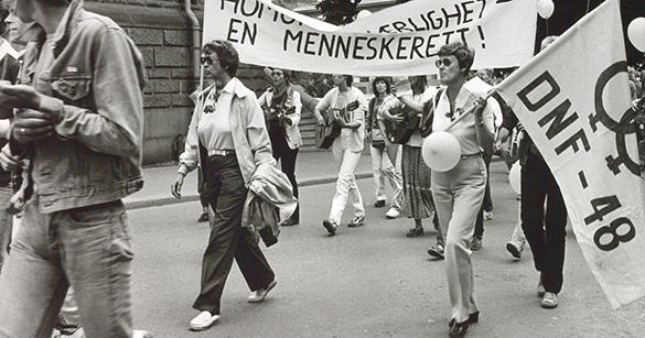 Wenche Lowzow (t.v.) og Kim Friele under Homodagene i Oslo i 1982. Foto: Turid Eikvam. SKA/A-0033. Løvetann, Skeivt arkiv.