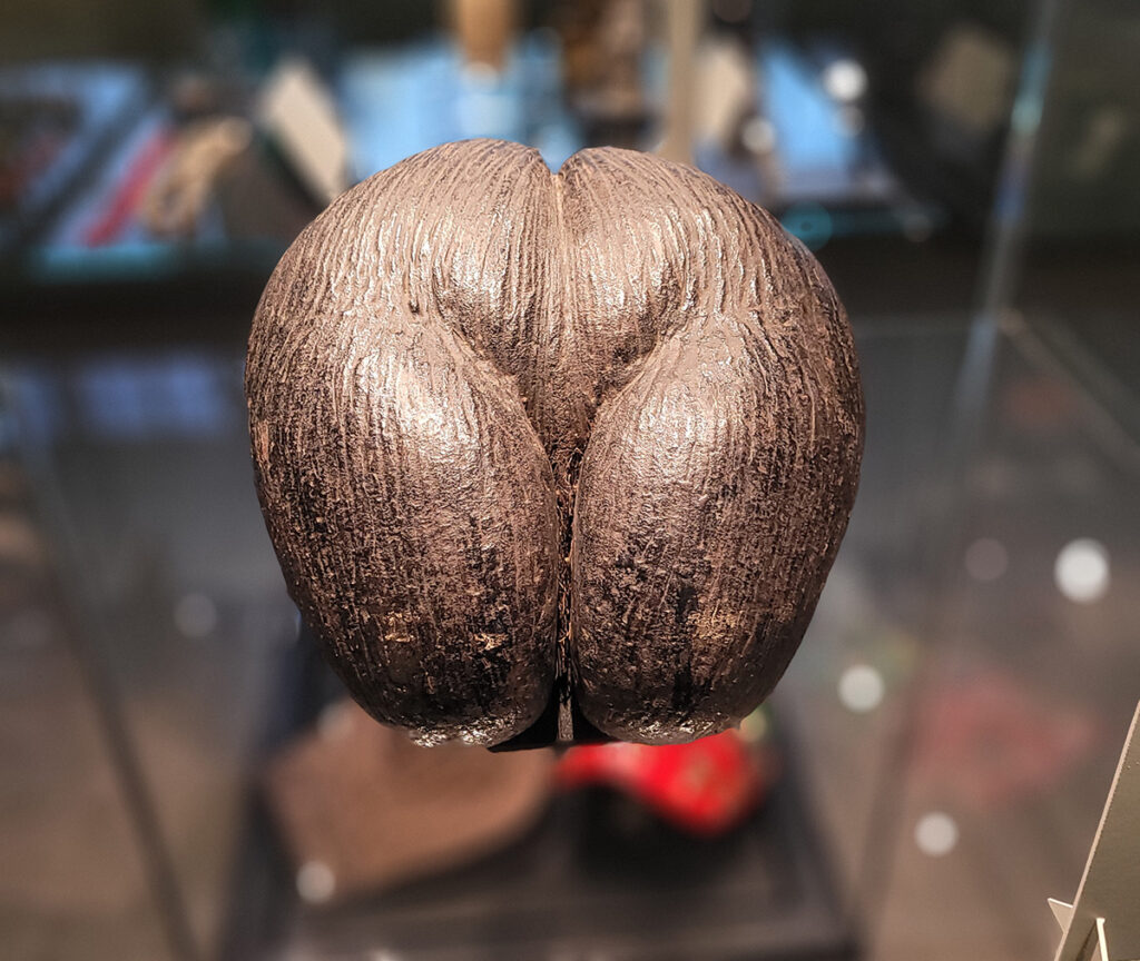 Den «doble kokosnøtten» Coco de Mer fra Seychellene er kjent for å likne et kvinnelig bekken og underliv. De karakteristiske frøene dannes på hunnpalmene, og har gitt den tilnavnet ‘Love nut’.